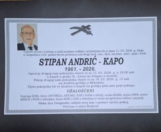 OBAVIJEST O SMRTI: Preminuo je Stipan Andrić – Kapo (1961.- 2026.)