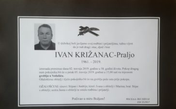 OBAVIJEST O SMRTI : Preminuo je Ivan Križanac – Praljo (1961. – 2019.) iz Vedašića