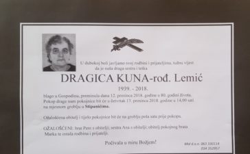 OBAVIJEST O SMRTI : PREMINULA JE DRAGICA KUNA, ROĐ.LEMIĆ( 1939. – 2018.) IZ STIPANIĆA