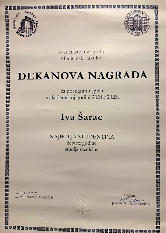 Iva Šarac, studentica 5. godine Medicinskog fakulteta Sveučilišta u Zagrebu, dobitnica je Dekanove nagrade za najbolju studenticu, za izuzetna akademska postignuća u akademskoj godini 2024/2025. Dekanova nagrada dodjeljuje se studentima koji se ističu izvrsnim uspjehom, predanošću studiju i postignućima tijekom školovanja. Ovo priznanje predstavlja veliko osobno postignuće, ali i ponos za njezinu obitelj, fakultet i naš kraj.