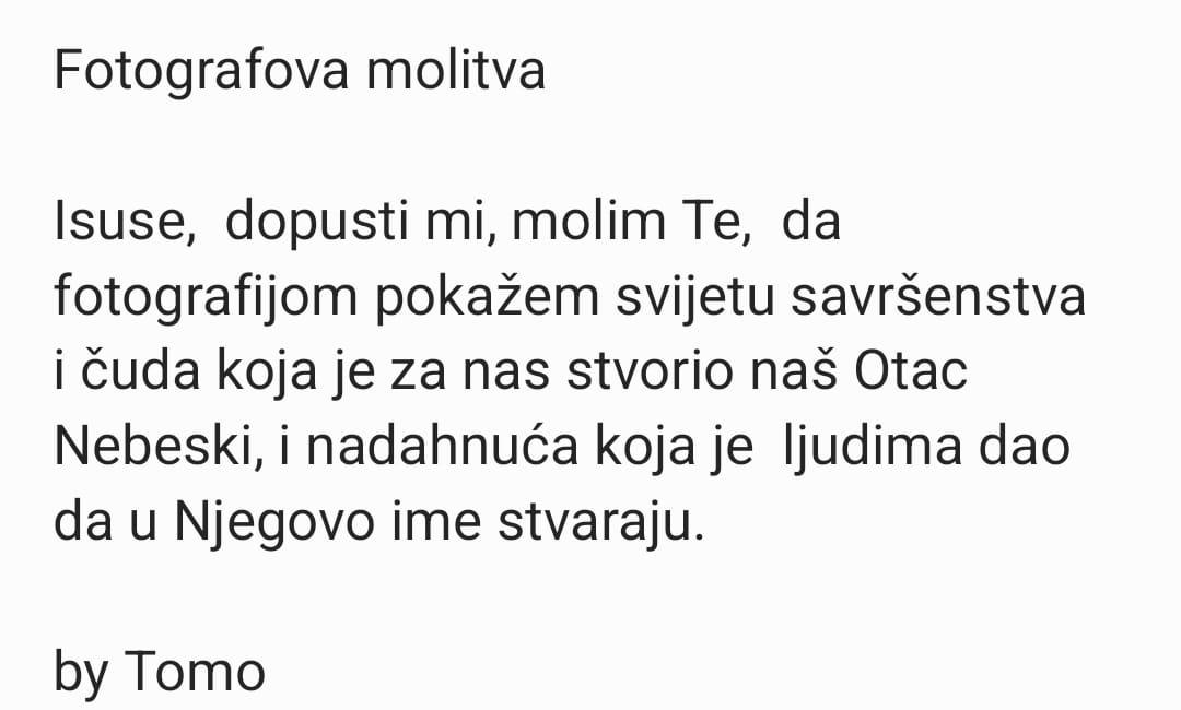 vjeraFOTO/Fotografova molitva: Isuse, dopusti mi, molim te…!tomislavnews8. prosinca 2025.posted on pro. 08, 2025 at 3:27 pm490Pregleda FOTOGRAFOVA MOLITVA www.tomislavnews.com Tagovi:fotografijamolitvatgtomoShare on FacebookShare on XMoretomislavnews8. prosinca 2025.prethodni članakNAJAVA: Božićne radionice za djecu održat će se 13. prosinca, 2025. u Tomislavgraduidući članakFOTO: Za ugodnu razmjerno vedru i prohladnu večer pogledajte malo duvanjskih lijepih krajobraza (7) Preporučujemo za vasobavijstivjeraOBAVIJESTI iz Župe svetog Mihovila Tomislavgrad: Svibanjska pobožnost započinje u petak 1. svibnja, 2026.tomislavnews26. travnja 2026.801 views801Pročitaj više...vjeraSPOMENDAN je sv. Marka evanđelista; molitva sv. Marku; objavljujemo pučke izreke o ovom danutomislavnews25. travnja 2026.588 views588Pročitaj više...TG ČestitkevjeraVIDEO/AKO NISTE ZNALI ili ste zaboravili : Danas (23.4.) je Jurjeva-Sveti Juraj – pučke izreke o Jurjevitomislavnews23. travnja 2026.640 views640Pročitaj više...
