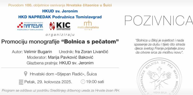 Povodom 100. obljetnice osnivanja Hrvatske čitaonice u Šuici, HKUD sv. Jeronim i HKD Napredak Tomislavgrad pozivaju na promociju monografije Bolnica s pečatom, Franjevačke bolnice u Novoj Biloj u petak, 29. kolovoza u 19h, u Hrvatskom domu Stjepan Radić u Šuici.