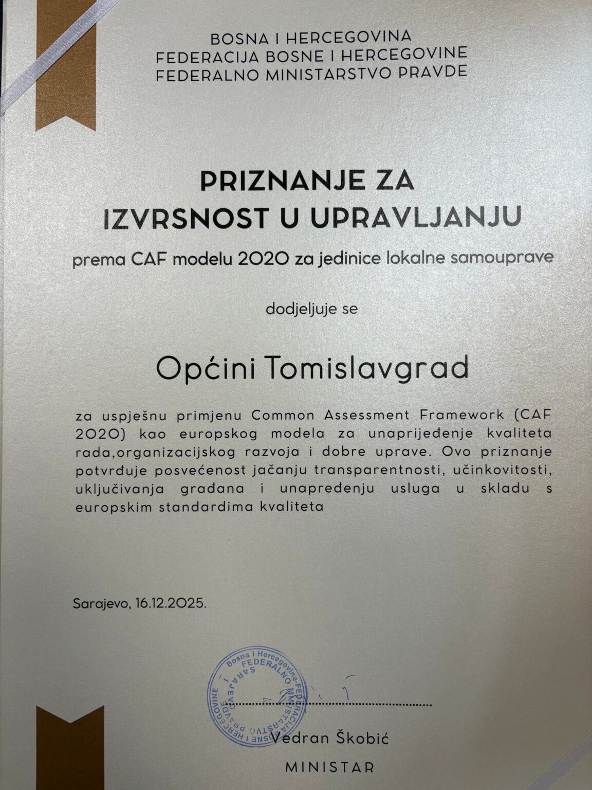 Događaj predstavlja prvi konkretan korak prema institucionalizaciji CAF modela u jedinicama lokalne samouprave u Federaciji BiH, s ciljem jačanja profesionalizma, unaprjeđenja kvaliteta javnih usluga te uvođenja europskih standarda upravljačke izvrsnosti u javnu upravu, u skladu s aktualnim reformskim procesima javne uprave.
