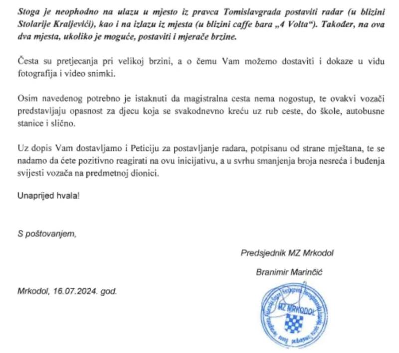 Zahtjev je predan na sljedeće adrese: Policijska uprava Tomislavgrad, Općina Tomislavgrad i MUP Livno. Uz Zahtjev je priložena i peticija koju je potpisalo 105 sumještana.