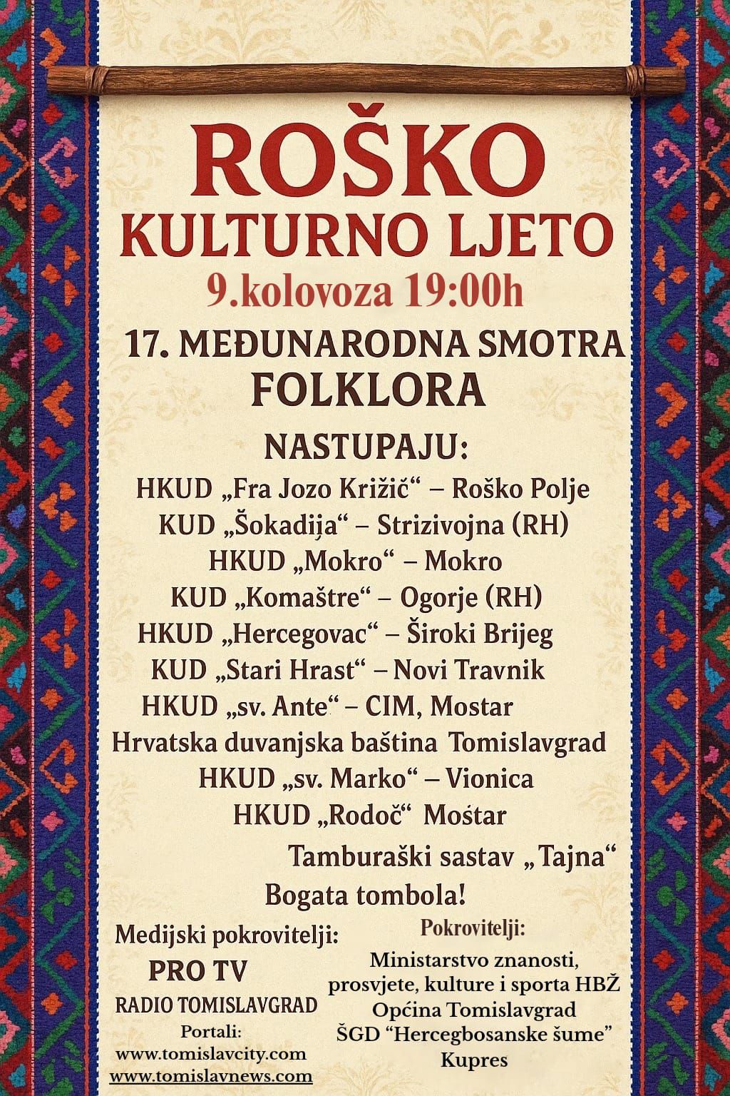 obavijstiTG Kultura/ZabavaNAJAVA: 17.Međunarodna smotra folklora u sklopu Roškog kulturnog ljeta 2025.tomislavnews23. srpnja 2025.posted on srp. 23, 2025 at 9:00 am23. srpnja 2025.859Pregleda 17.Međunarodna smotra folklora u sklopu Roškog kulturnog ljeta 2025. održat će se 9. kolovoza u 19:00 sati. VIŠE INFORMACIJA NA PLAKATU! www.tomislavnews.com Tagovi:folklorapoljeroškosmotratgShare on FacebookShare on XMoretomislavnews23. srpnja 2025.prethodni članakPODSJEĆAMO: “Spomen na Pomen”, planinarenje “Putevima naših poginulih”, Stipića livada 2025.idući članakFOTO: 16. Međunarodna speleološka i znanstveno – istraživačka ekspedicija Mijatovih dvora “Srce Čvrsnice” donosi brojne rezultate! Preporučujemo za vasTG Kultura/ZabavaTG VijestiFOTO POHVALA: Učenici i djelatnici Osnovne škole Ivana Mažuranića sudjelovali su u nizu ekoloških i edukativnih aktivnosti u očuvanju okolišatomislavnews29. travnja 2026.475 views475Pročitaj više...TG ČestitkeTG Kultura/ZabavaFOTO NAJAVA: Priča koja se pamti – oproštajna večer maturanatatomislavnews29. travnja 2026.468 views468Pročitaj više...SvijetTG Kultura/ZabavaVIDEO: Danas je Svjetski dan plesa, pogledajte kako se plesalo u Tomislavgradu prije 12 godina!tomislavnews29. travnja 2026.523 views523Pročitaj više...