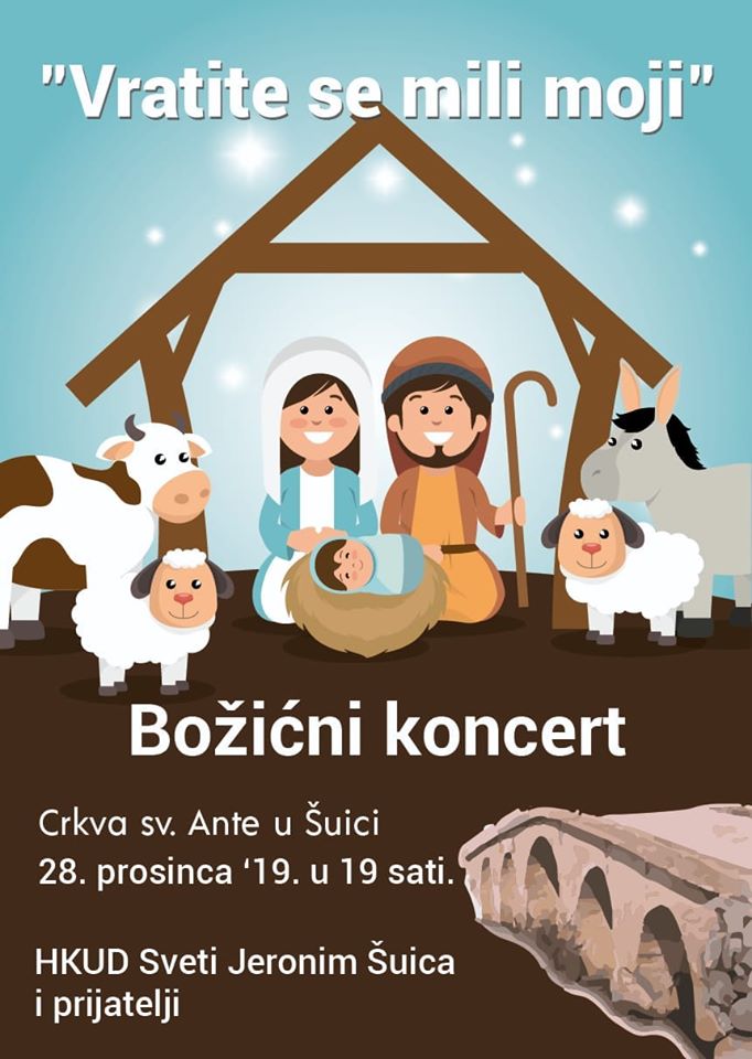 Dana 28. prosinca, 2019. godine, u Župnoj crkvi svetog Ante u Šuici, s početkom u 19.00 sati, ako Bog da, održat će se tradicionalni Božićni koncert ovaj put posvećen “Iseljenoj Šuici i njezinoj mladosti” .