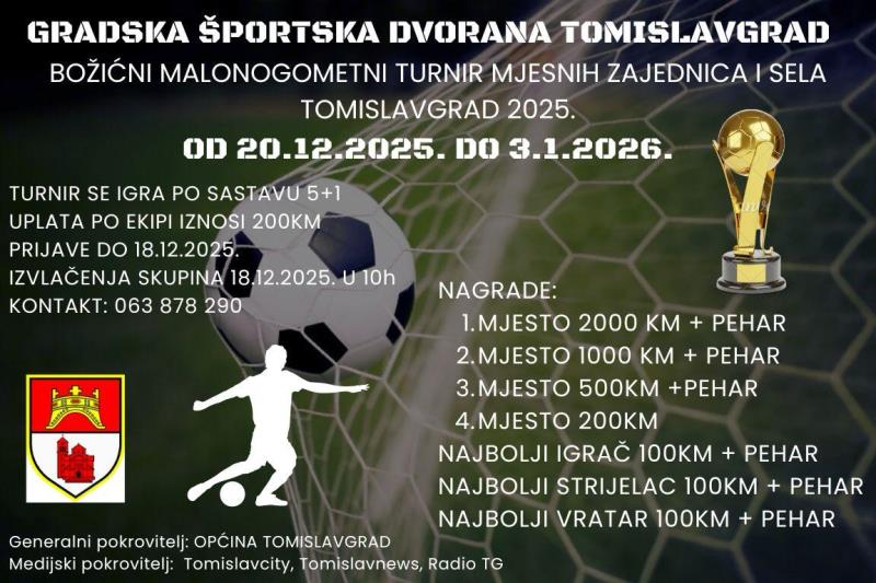 TG SportNAJAVA: BOŽIĆNI malonogometni turnir mjesnih zajednica i sela-Tomislavgrad 2025.tomislavnews3. prosinca 2025.posted on pro. 03, 2025 at 9:02 am989Pregleda U organizaciji Gradske športske dvorane Tomislavgrad i ove godine održat će se Božićni malonogometni turnir mjesnih zajednica i sela-Tomislavgrad 2025. VIŠE INFORMACIJA! www.tomislavnews.com/GŠD Tagovi:bozicnigsdnajavatgturnirShare on FacebookShare on XMoretomislavnews3. prosinca 2025.prethodni članakDOBRO vam oblačno, kišovito i maglovito jutro iz Tomislavgrada!idući članakPITANJE ČITATELJA: Je li ovo početak posljednjih dana? Preporučujemo za vasobavijstiTG SportOBAVIJEST: Boris Grbavac više nije trener HNK “Tomislav” Tomislavgradtomislavnews27. travnja 2026.631 views631Pročitaj više...TG SportHNK “TOMISLAV”: Rezultati odigranih utakmica i najava današnjih!tomislavnews27. travnja 2026.445 views445Pročitaj više...TG SportČESTITAMO: Pobjednik Bavaria pikado lige BiH je Tomica Zrno!tomislavnews26. travnja 2026.1.86K views1.86KPročitaj više...