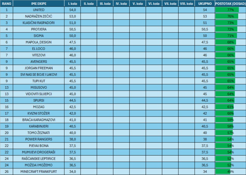 Napominjemo, ako se propustili prvo kolo i dalje se možete priključiti u ligu, jer u konačni poredak ulazi 7 najboljih rezultata vaše ekipe, odnosno najlošiji rezultat ne ubrajamo u ligu.