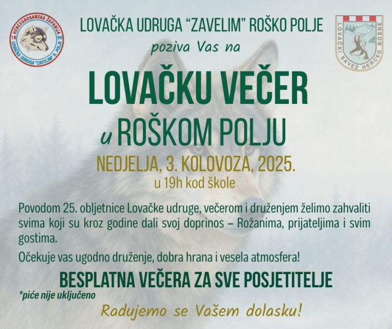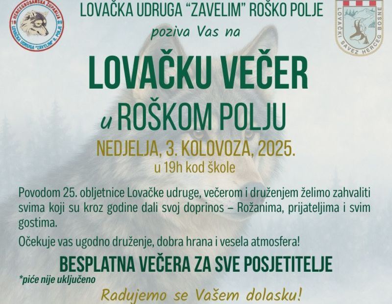 Lovačka udruga “Zavelim” Roško Polje poziva vas na Lovačku večer koja će se održati kod škole u Roškom Polju, u nedjelju, 3. kolovoza s početkom u 19 sati.
