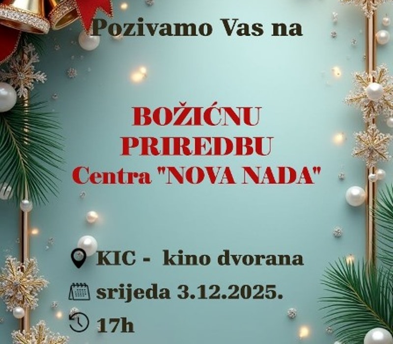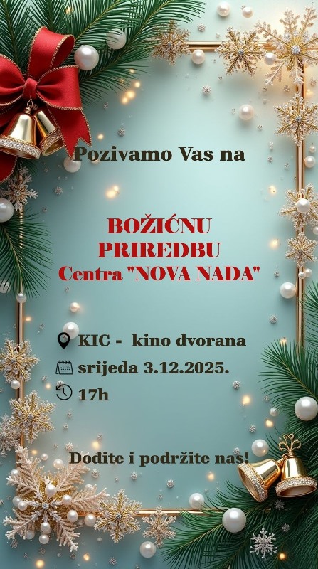obavijstiTG Kultura/ZabavaNAJAVA I POZIV na Božićnu priredbu Centra “Nova nada”!tomislavnews27. studenoga 2025.posted on stu. 27, 2025 at 11:13 am1.26KPregleda U kino-dvorani KIC-a u Tomislavgradu, 3. prosinca, 2025. godine, održat će se “Božićna priredba” Centra “Nova nada”-Kovači, Tomislavgrad. SVI STE DOBRO DOŠLI, RADUJEMO SE! www.tomislavnews.com Tagovi:božićnacentardanakovačinovapriredbatgShare on FacebookShare on XMoretomislavnews27. studenoga 2025.prethodni članakNAJAVA: XX. sjednica Skupštine HBŽ održat će se 3. prosinca, 2025. godine, u Tomislavgraduidući članakOBAVIJEST O SMRTI: Preminula je Anđa Radoš, rođ. Dodig (1946. – 2025.) Preporučujemo za vasTG Kultura/ZabavaTG VijestiFOTO POHVALA: Učenici i djelatnici Osnovne škole Ivana Mažuranića sudjelovali su u nizu ekoloških i edukativnih aktivnosti u očuvanju okolišatomislavnews29. travnja 2026.473 views473Pročitaj više...TG ČestitkeTG Kultura/ZabavaFOTO NAJAVA: Priča koja se pamti – oproštajna večer maturanatatomislavnews29. travnja 2026.468 views468Pročitaj više...SvijetTG Kultura/ZabavaVIDEO: Danas je Svjetski dan plesa, pogledajte kako se plesalo u Tomislavgradu prije 12 godina!tomislavnews29. travnja 2026.523 views523Pročitaj više...