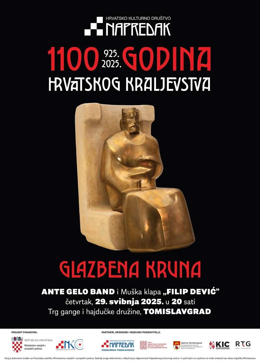 U povodu velikog jubileja – 1100. obljetnice krunidbe kralja Tomislava i utemeljenja Hrvatskoga Kraljevstva (925. – 2025.), Hrvatsko kulturno društvo Napredak i Organizacijski odbor 1100. obljetnice krunidbe kralja Tomislava na Duvanjskom polju organiziraju svečani koncert pod nazivom “Glazbena kruna”, koji će se održati u četvrtak, 29. svibnja 2025. godine, s početkom u 20:00 sati, na Trgu gange i hajdučke družine u Tomislavgradu.