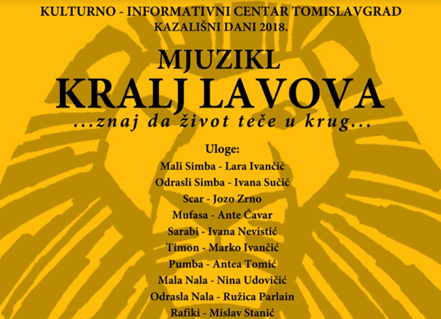 U subotu, 10. studenog, 2018. godine, u 19,00 sati, u kino-dvorani KIC-a u Tomislavgradu, u okviru Kazališnih dana, bit će izveden mjuzikl “Kralj lavova”…