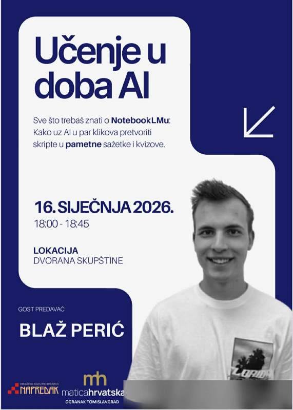 Hrvatsko kulturno društvo Napredak Tomislavgrad i ogranak Matice hrvatske u Tomislavgradu organiziraju predavanje na temu: Učenje u doba AI – Sve što trebaš znati o NotebookLMu: Kako uz AI u par klikova pretvoriti skripte u pametne sažetke i kvizove.