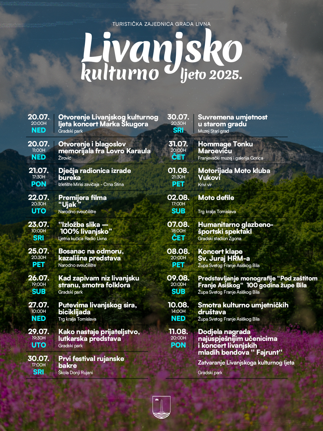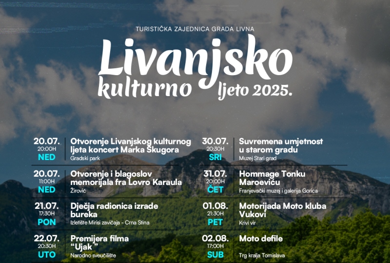 Predstavljamo vam ovogodišnji program Livanjskog kulturnog ljeta koje će se održati od 20. srpnja do 11. kolovoza na različitim lokacijama na području Livna. ![]()