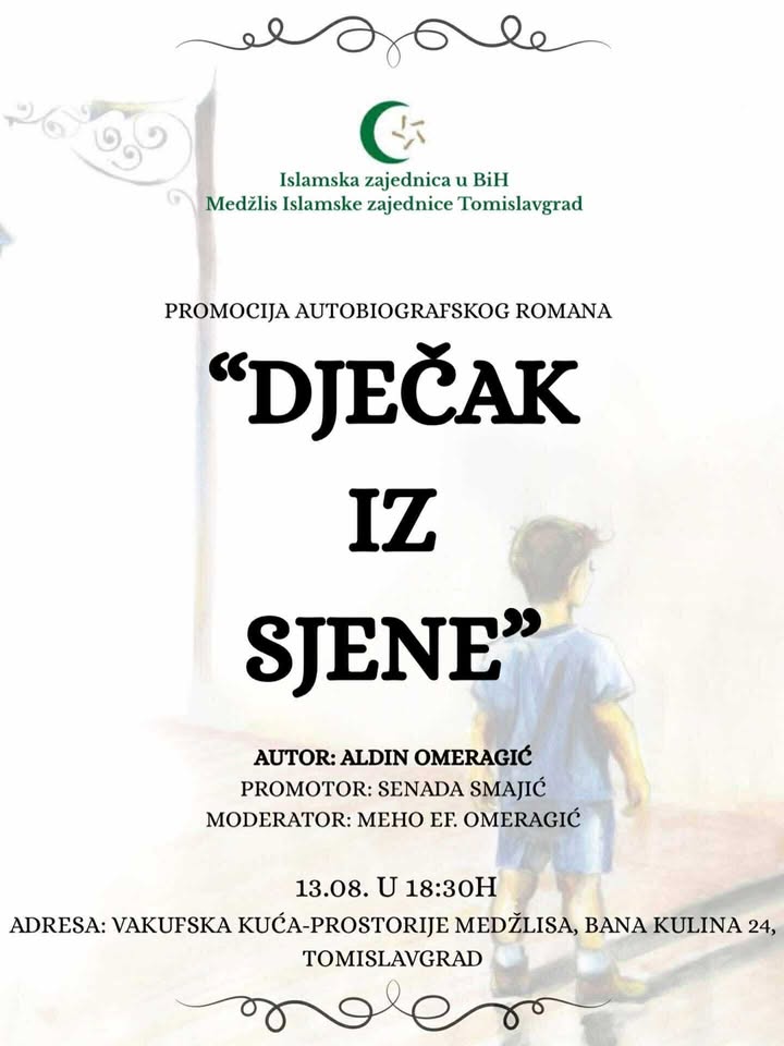 U organizaciji Islamske zajednice BiH, Medžlisa zajednice Tomislavgrad, u srijedu, 13. kolovoza, 2025. godine, ispred Medžlisa Tomislavgrad, s početkom u 18:30 sati, održat će se promocija autobiografskog romana “Dječaj iz sjene”, autora Aldina Omeragića.