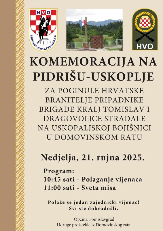 U organizaciji udruga iz Domovinskoga rata i Općine Tomislavgrad na Pidrišu (općina Uskoplje), u nedjelju 21. rujna 2025. godine bit će održana komemoracija za stradale hrvatske branitelje, među kojima su i pripadnici Brigade kralja Tomislava. Protokolom je u 10:45 predviđeno polaganje vijenaca i paljenje svijeća, a u 11 sati bit će služena sveta misa za stradale vitezove
