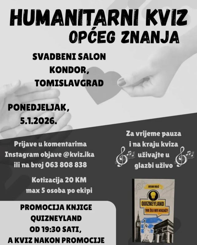 Udruga kvizaša Kvizika u suradnji s HKD Napredak Tomislavgrad i udrugom Kap ljubavi organizira veliki Humanitarni kviz općeg znanja, u sklopu kojega će biti predstavljena knjiga Quizneyland.