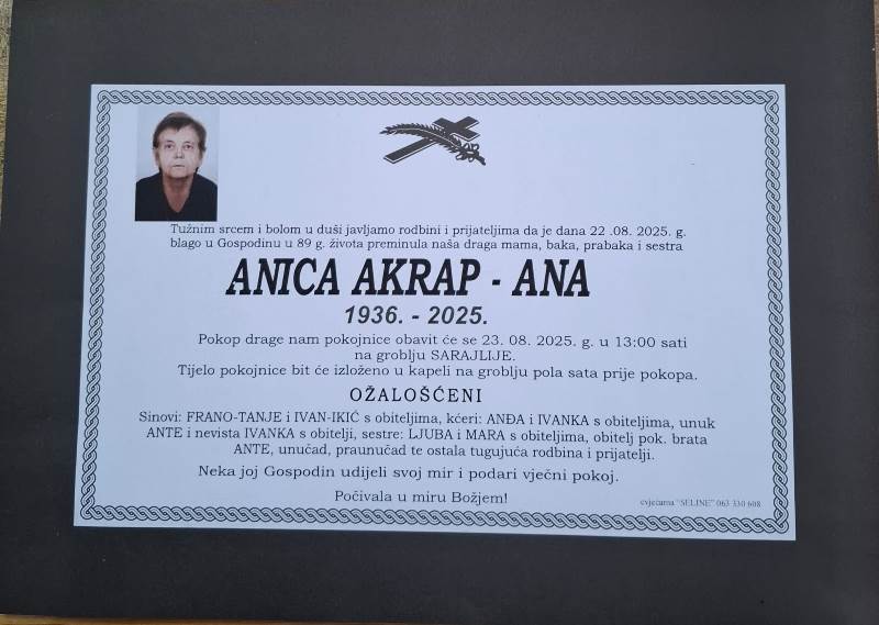 Tužnim srcem i bolom u duši javljamo svoj rodbini i prijateljima tužnu vijest da je naša draga Anica Akrap – Ana, blago u Gospodinu preminula 22. kolovoza, 2025. godine, u 89. godini života.