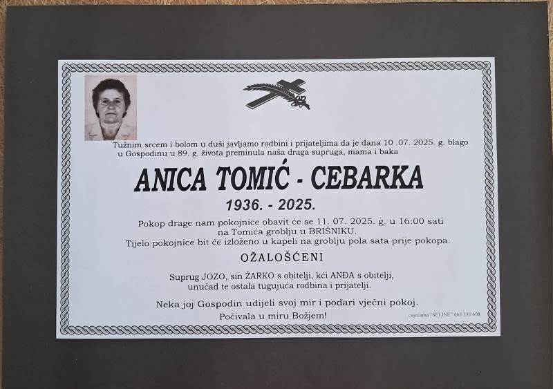 Tužnim srcem i bolom u duši javljamo svoj rodbini i prijateljima tužnu vijest da je naša draga Anica Tomić-Cebarka, blago u Gospodinu preminula 10. srpnja, 2025. godine, u 89. godini života.