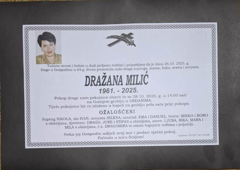 Tužnim srcem i bolom u duši javljamo svoj rodbini i prijateljima tužnu vijest da je naša draga Dražana Milić blago u Gospodinu preminula 26. listopada, 2025. godine, u 64. godini života.