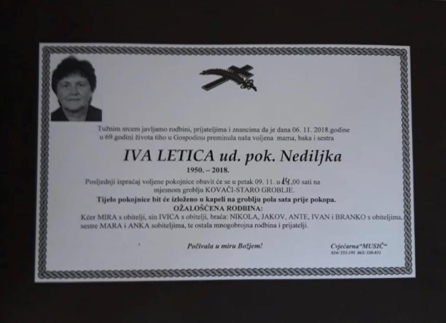 Tužnim srcem javljamo svoj rodbini, prijateljima i znancima tužnu vijest da je naša draga Iva Letica, blago u Gospodinu preminula dana 6. studenog, 2018. godine, u 69. godini života.
