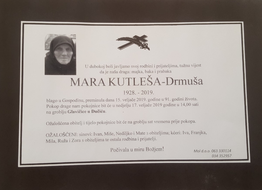 U dubokoj bili javljamo svoj rodbini prijateljima tužnu vijest da je naša draga Mara Kutleša – Drmuša blago u Gospodinu preminula 15. veljače, 2019, godine , u 91. godini života.