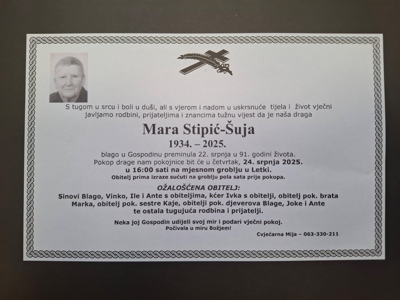 Tužnim srcem i bolom u duši, ali s vjerom i nadom u uskrsnuće tijela i život vječni, javljamo svoj rodbini i prijateljima tužnu vijest da je naša draga Mara Stipić-Šuja, blago u Gospodinu preminula 22. srpnja, 2025. godine, u 91. godini života.