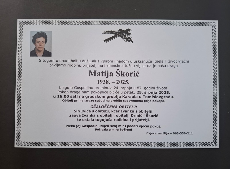 Tužnim srcem i bolom u duši, ali s vjerom i nadom u uskrsnuće tijela i život vječni, javljamo svoj rodbini i prijateljima tužnu vijest da je naša draga Matija Škorić, blago u Gospodinu preminula 24. srpnja, 2025. godine, u 87. godini života.