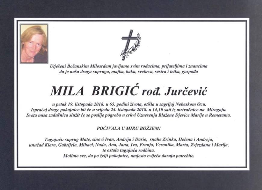 Utješeni Božanskim Milosrđem javljamo svim rođacima, prijateljima i znancima da je naša draga Mila Brigić, rođ. Jurčević, (iz Stipanjića, a živjela u Zagrebu),  u petak, 19.listopada, 2018. godine, u 65. godini života, otišla u zagrljaj Nebeskom Ocu.