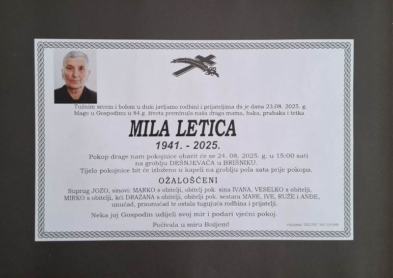 Tužnim srcem i bolom u duši javljamo svoj rodbini i prijateljima tužnu vijest da je naša draga Mila Letica blago u Gospodinu preminula 23. kolovoza, 2023. godine, u 84. godini života.