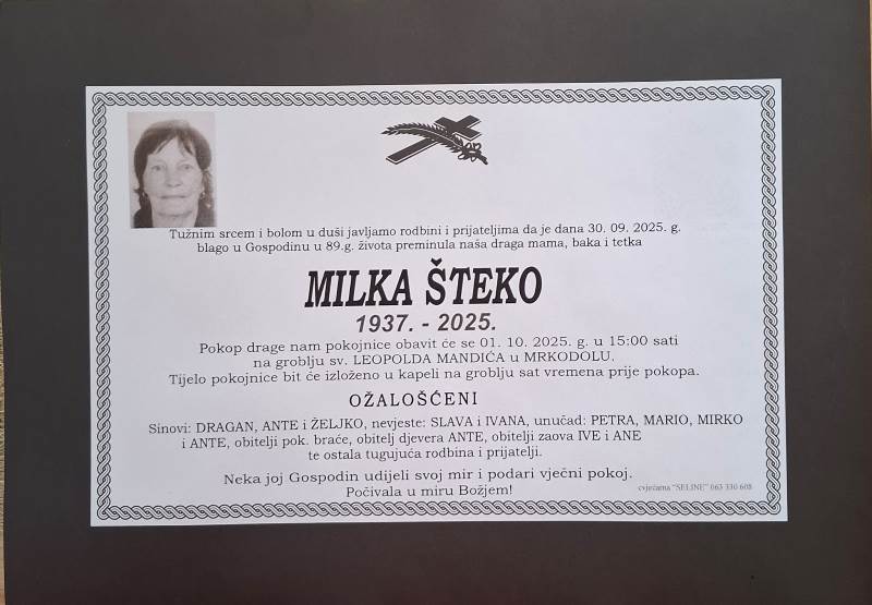 Tužnim srcem i bolom u duši javljamo svoj rodbini i prijateljima tužnu vijest da je naša draga Milka Šteko blago u Gospodinu preminula 30. rujna, 2025. godine, u 89. godini života.
