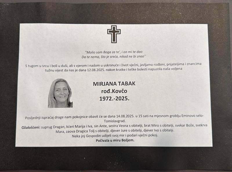 S tugom u srcu i bolom u duši, ali s vjerom i nadom u uskrsnuće tijela i život vječni, javljamo rodbini, prijateljima i znancima tužnu vijest da je naša draga Mirjana Tabak (rođ. Kovčo), nakon kratke i teške bolesti, blago u Gospodinu preminula 12. kolovoza, 2025. godine.