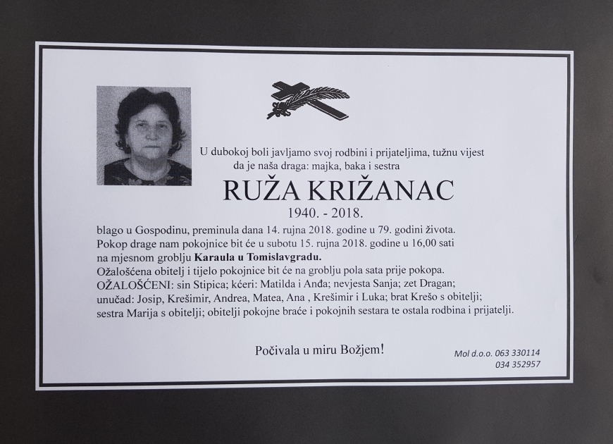 U dubokoj boli javljamo svoj rodbini prijateljima tužnu vijest da je naša draga Ruža Križanac iz Tomislavgrada blago u Gospodinu preminula 14. rujna, 2018. godine, u 79. godini života.