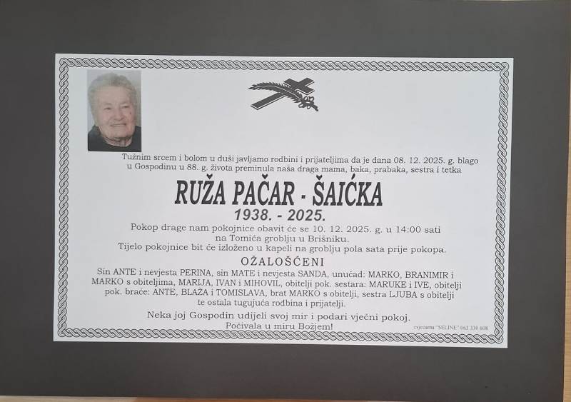 Tužnim srcem i bolom u duši javljamo svoj rodbini i prijateljima tužnu vijest da je naša draga Ruža Pačar-Šićka, blago u Gospodinu preminula 8, prosinca, 2025. godine, u 88. godini života.