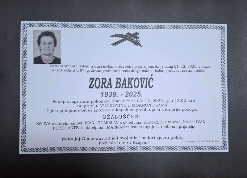 S tugom u srcu i bolom u duši javljamo svoj rodbini i prijateljima tužnu vijest da je naša draga Zora Baković, blago u Gospodinu preminula 1. prosinca, 2025. godine, u 87. godini života.