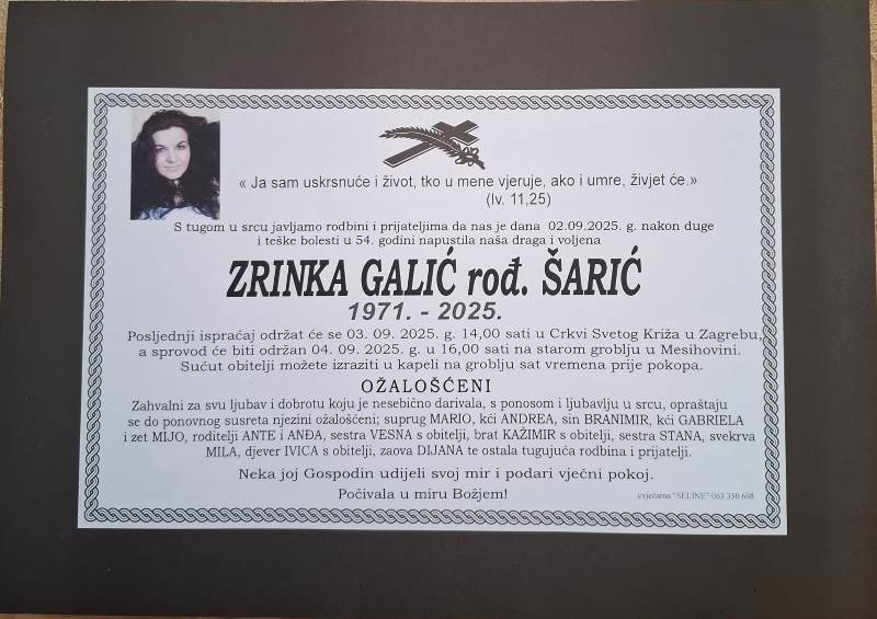 S tugom u srcu i bolom u duši javljamo svoj rodbini i prijateljima tužnu vijest da je naša draga Zrinka Galić, rođena Šarić, nakon duge i teške bolesti, blago u Gospodinu, preminula 2. rujna, 2025. godine, u 54. godini života.