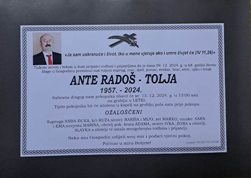 Tužnim srcem i bolom u duši javljamo svoj rodbini i prijateljima tužnu vijest da je naš dragi Ante Radoš -Tolja, blago u Gospodinu preminuo 9. prosinca, 2024. godine, u 68. godini života.
