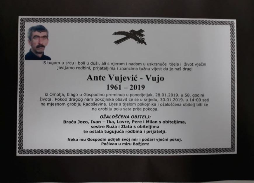S tugom u srcu i boli u duši, ali s vjerom i nadom u uskrsnuće tijela i život vječni, javljamo svoj rodbini i prijateljima tužnu vijest da je naš dragi Ante Vujević – Vujo, iz Omolja, blago u Gospodinu preminuo u ponedjeljak, 28. siječnja, 2019. godine, u 58. godini života.