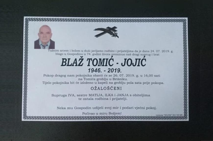 Tužnim srcem i bolom u duši javljamo svoj rodbini i prijateljima tužnu vijest da je naš dragi Blaž Tomić – Jojić iz Brišnika, blago u Gospodinu preminuo 24. srpnja, 2019, godine, u 74, godini života,