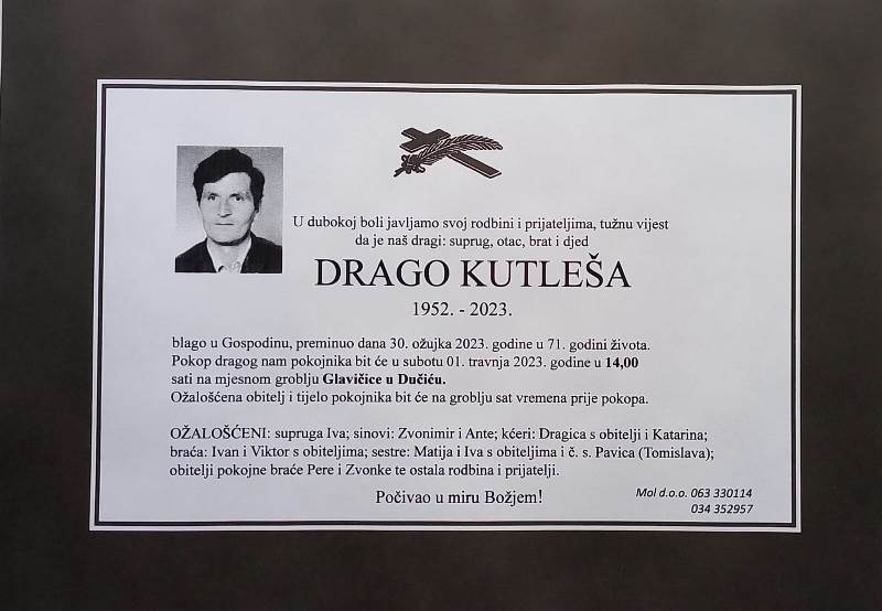 U dubokoj boli javljamo svoj rodbini i prijateljima tužnu vijest da je naš dragi Drago Kutleša, blago u Gospodinu preminuo 30. ožujka, 2032. godine, u 71. godini života.