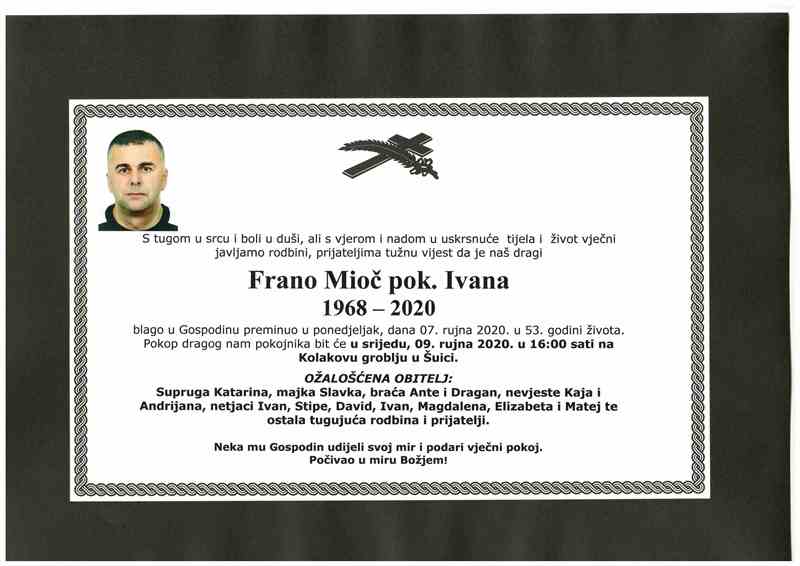 S tugom u srcu i bolom u duši, ali s vjerom i nadom u uskrsnuće tijela i život vječni, javljamo svoj rodbini i prijateljima tužnu vijest da je naš dragi Frano Mioč, pokojnog Ivana, blago u Gospodinu preminuo u ponedjeljak, 7. rujna, 2020. godine, u 53. godini života.