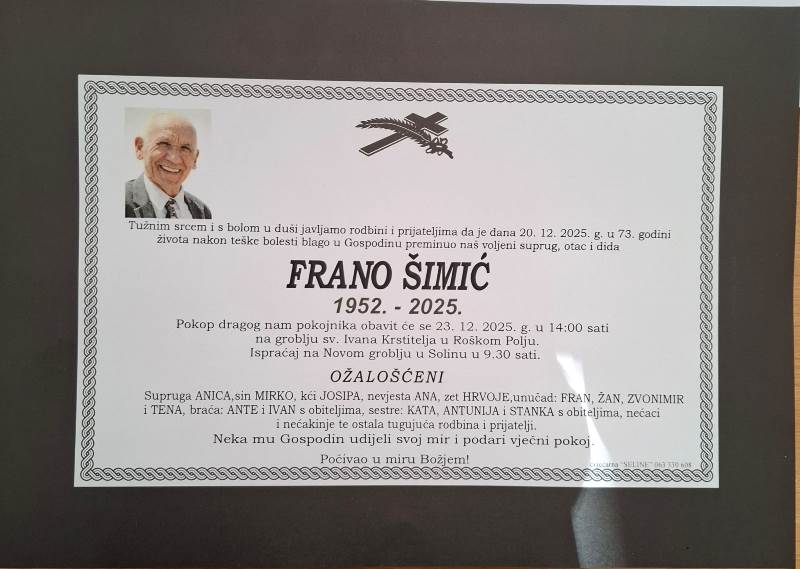 Tužnim srcem i bolom u duši javljamo svoj rodbini i prijateljima tužnu vijest da je naš dragi Frano Šimić, blago u Gospodinu preminuo 22. prosinca, 2025. godine, u 73. godini života.