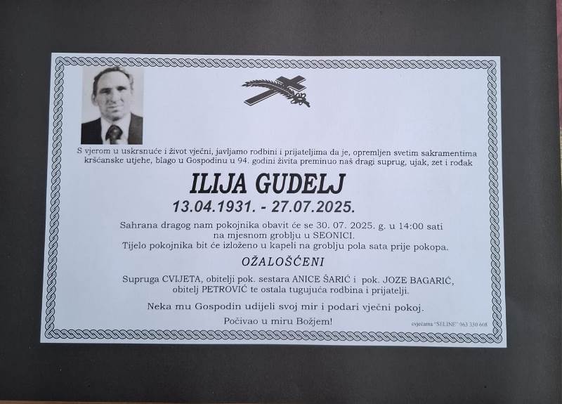 S vjerom u uskrsnuće i život vječni, javljamo svoj rodbini i prijateljima tužnu vijest da je naš dragi Ilija Gudelj, opremljen svetim sakramentima kršćanske utjehe, blago u Gospodinu preminuo 27. srpnja, 2025. godine, u 94. godini života.