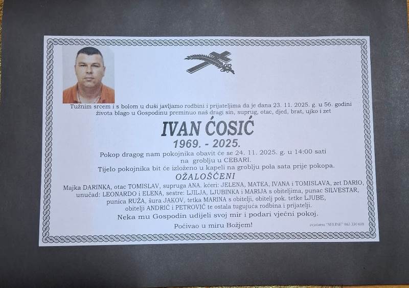 Tužnim srcem i bolom u duši javljamo svoj rodbini i prijateljima tužnu vijest da je naš dragi Ivan Ćosić, blago u Gospodinu preminuo 23. studenoga, 2025. godine, u 56. godini života.