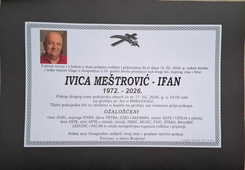 Tužnim srcem i bolom u duši javljamo svoj rodbini i prijateljima tužnu vijest da je naš dragi Ivica Meštrović – Ifan blago u Gospodinu preminuo 15. veljače, 2026. godine, u 54. godini života.