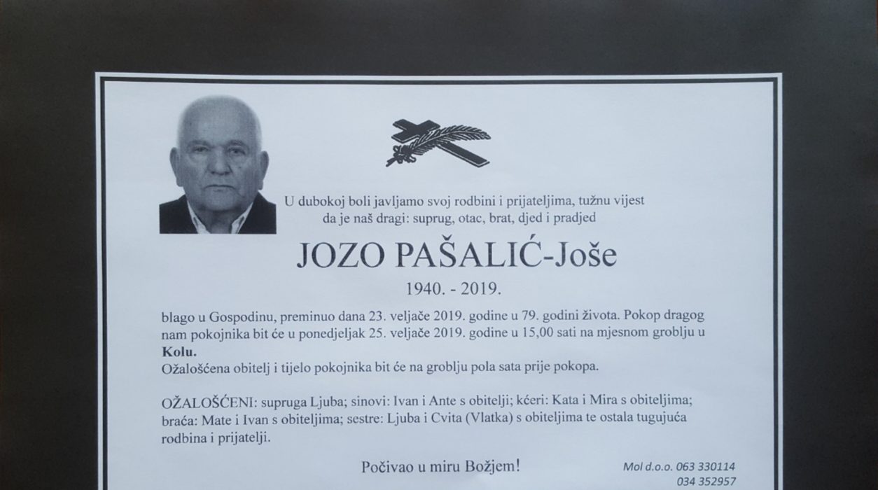 U dubokoj boli javljamo svoj rodbini i prijateljima tužnu vijest da je naš dragi Jozo Pašalić-Joše s Kola – Tomislavgrad, blago u Gospodinu preminuo 23. veljače, 2019. godine, u 79. godini života.