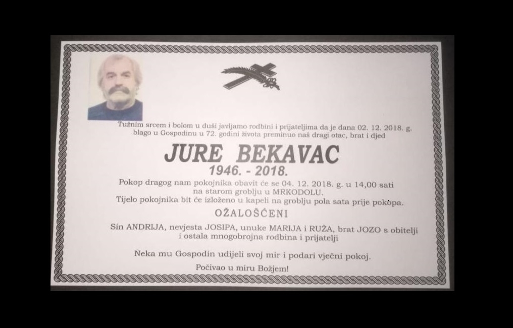 Tužnim srcem i  bolom u duši javljamo svoj rodbini i prijateljima tužnu vijest da je naš dragi Jure Bekavac iz Mrkodola blago u Gospodinu preminuo 2. prosinca, 2018. godine, u 72. godini života.