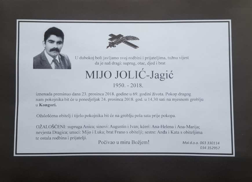 U dubokoj boli javljamo svoj rodbini i prijateljima tužnu vijest da je naš dragi Mijo Jolić iznenada preminuo 23. prosinca, 2018. godine, u 69. godini života.