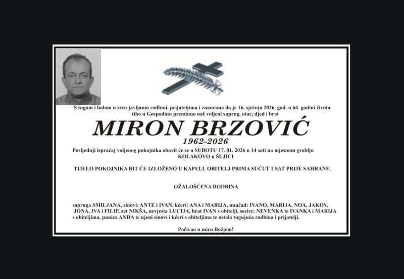 S tugom u srcu i bolom u duši javljamo svoj rodbini i prijateljima i tužnu vijest da je naš dragi Miron Brzović, blago u Gospodinu preminuo 16. siječnja, 2026. godine u 64. godini života.