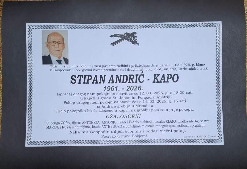 Tužnim srcem i bolom u duši javljamo svoj rodbini i prijateljima tužnu vijest da je naš dragi Stipan Andrić -Kapo blago u Gospodinu preminuo 11. ožujka, 2026. godine, u 65. godini života.